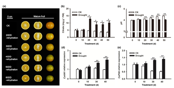 有机酸是柑橘果实内在品质的重要组成,直接影响果实风味及消费者的认可度。研究发现,在7-9月(果实膨大期)冰糖橙持续干旱20d以上,果实膨大受阻;持续干旱30d以上显著影响果实酸积累,果实中酸含量尤其是柠檬酸发生不可逆升高,即使后期复水也无法逆转果实变小和高酸表型。研究结果为柑橘科学灌溉提供了理论依据。