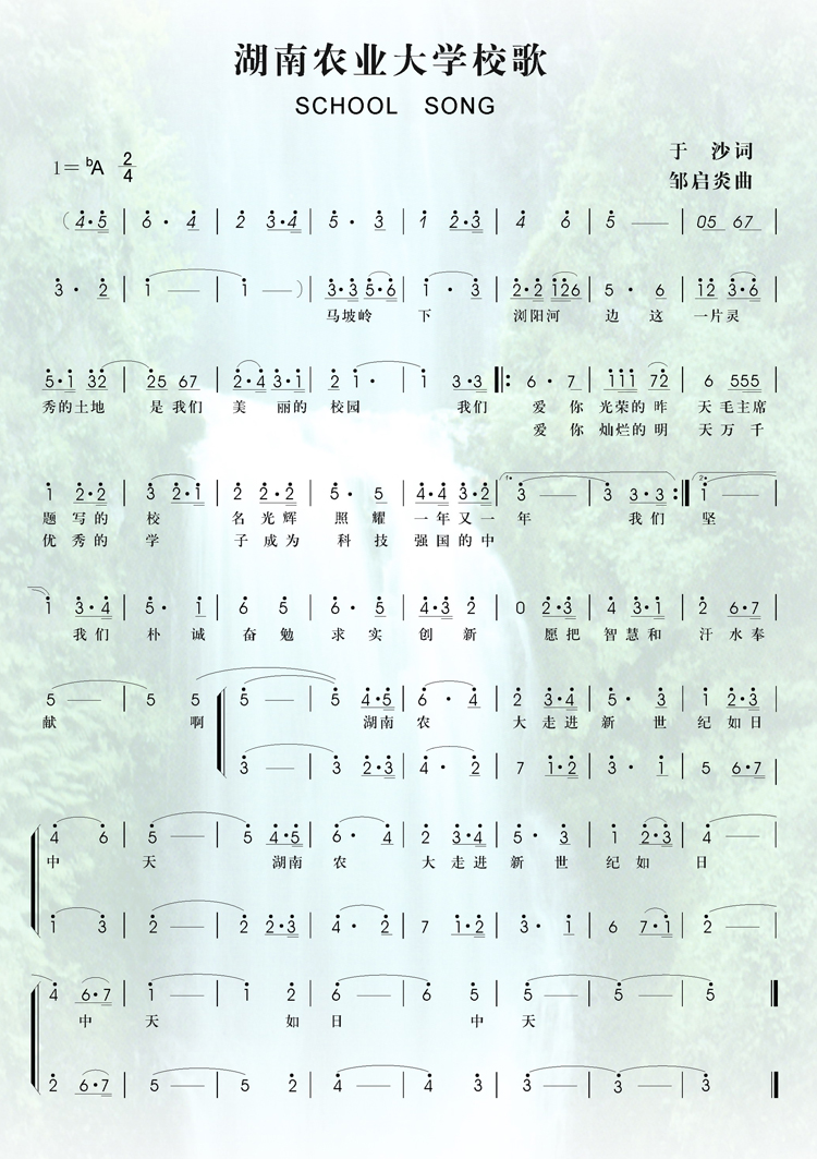 标准字“湖南农业大学”为毛体字,确定了1903为学校办学时间。校徽设计将湖南农业大学最有代表性的第一教学楼采用图形简化的方式进行重新设计,代表了农大辉煌的历史和深厚的文化底蕴,下面的图形则寓意了农大这片肥沃的土地,象征了农大秉持教书育人的使命。徽章确定了红色和绿色作为标准色,红色部分象征了热情和自信,突出了农大人奋进的精神;绿色部分突出农大这一片勃勃生机的土地、象征着稳步发展与绿色环保的农大。